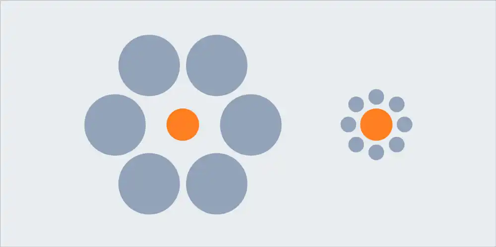 The majority of people believe that the orange circle on the left is smaller than the circle on the right. This is the precise purpose of the illusion if you did. Although the two orange circles are exactly the same size, the surrounding smaller circles will make the orange circle appear larger to your eyes.