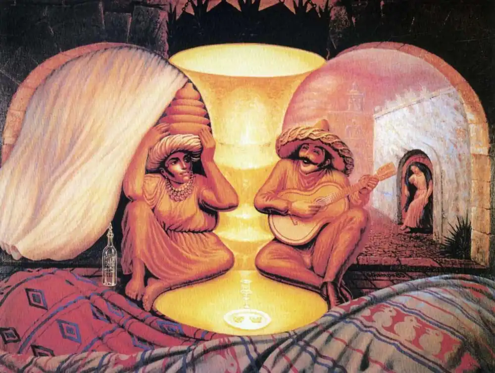 This masterpiece, Forever Always, was created by a surrealist artist. It displays two pictures. Some observe the young couple initially seated next to each other, indicating that they are still quite young. With their entire lives ahead of them, they can rejoice in this fact. Those who view the profiles of the older couple are happy and have achieved their goals.