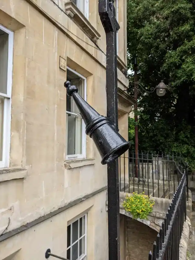What is the purpose of the iron cones in front of the entrance to the building in Bath, England on both sides of the gate?