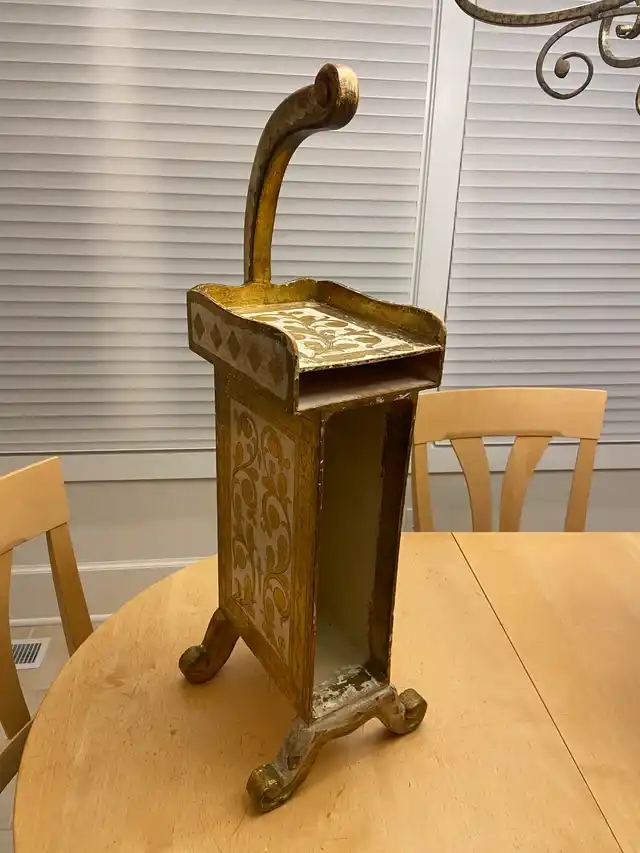 Answer (by u/raygunnysack): Italian Florentine-style phone stand. I forgot to mention that the drawer is a good idea for stationery, paper and a personal phone book. You can store your city phone book or books in the vertical cavity. It is movable using the handle at the top.