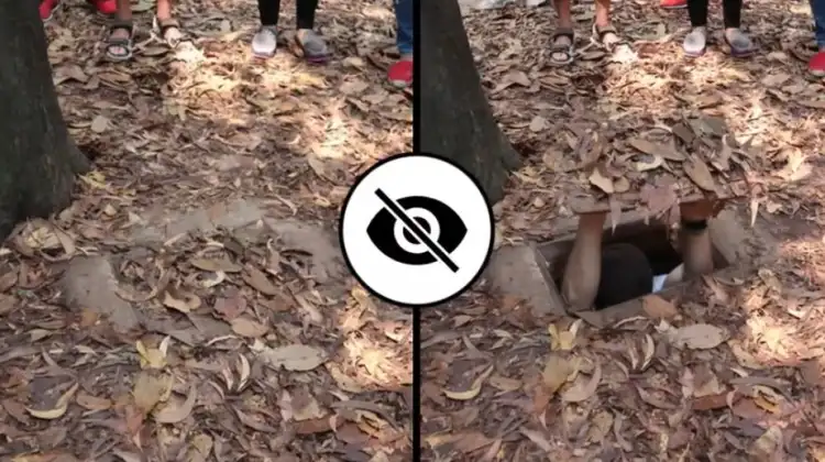 The Cu Chi Tunnels, a network of underground tunnels used by soldiers during the Vietnam War, are pictured below at one of their entrances. Trapdoor tunnel entrances that are virtually invisible when closed and covered by foliage allow communist Vietnamese soldiers, or “Viet Congs,” to remain hidden from enemy forces.