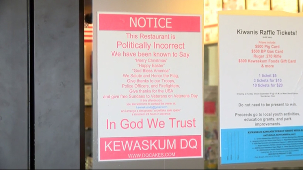 Dairy Queen said it disagreed with the franchise owner’s thinking. DQ’s corporate office released a statement that read: “This sign represents only the views of this independent owner and does not represent ADQ Corporation or any of our other independent franchise owners. They expect their franchisees and employees to deal with everyone who enters the building with respect and dignity Nothing less is acceptable.