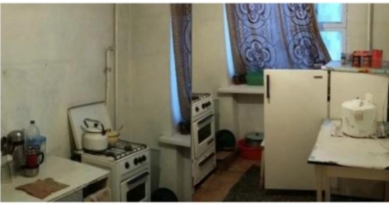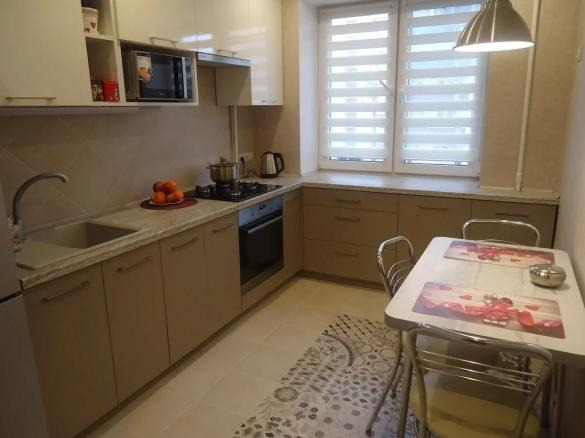 First, they went into the kitchen. When the family first moved into the room, there was no set, so they ordered a corner kitchen. A large amount of space allows for easier and more pleasant cooking and storage processes. Beige tiles were installed.