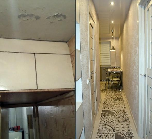 The family bought brand-new sofas and a table. Above them hung a lamp with a silver shade. Their tones blend wonderfully with the unique environment. The corridor that connects the living areas and the kitchen has also received significant modifications.