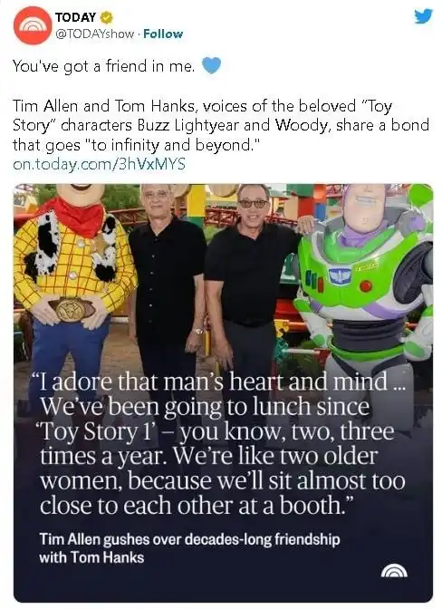 Allen recently expressed his level of confidence in Hanks when he appeared on The Kelly Clarkson Show. Allen respects Hanks for his heart and intelligence despite their differing opinions on many topics. Ever since they worked together on “Toy Story 1,” they’ve been meeting for lunch twice a year. Their connection is so strong that they sometimes sit at a table together and resemble two older women.