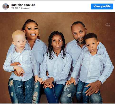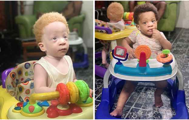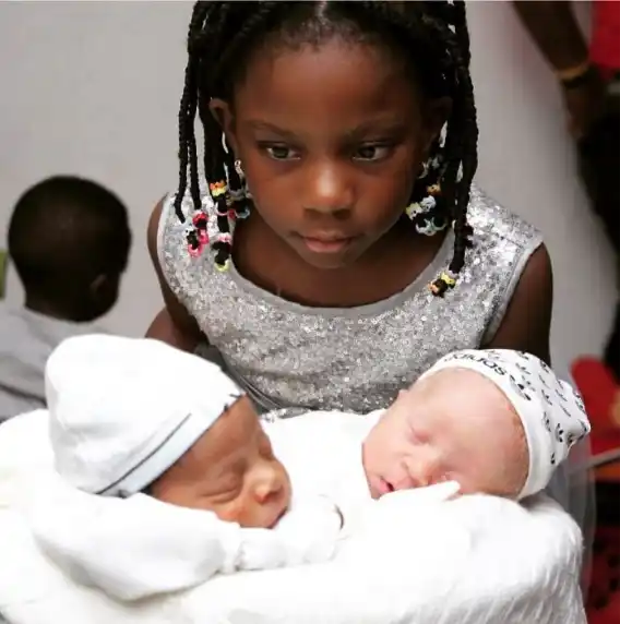 Two black children, Stacy and Babajide, who live in Lagos, are both albino. The strikingly different looks of the adorable twins make them the life of the party wherever they go. David is strikingly white, with pale skin and golden hair, while Daniel, who has dark skin and black curly hair, resembles his sister Demilada, who is 5 years older.
