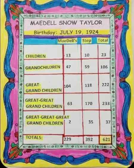 With MaeDell having a whopping 621 offspring, this approach has created an amazing legacy. This includes her two biological great-great-grandchildren, 63 biological great-great-grandchildren, 104 great-great-grandchildren, and 13 biological children.