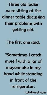The first answer was, “Sometimes I find myself standing in front of the fridge with a jar of mayo in my hand, and I can’t remember if I need to put it down or start making a sandwich.”