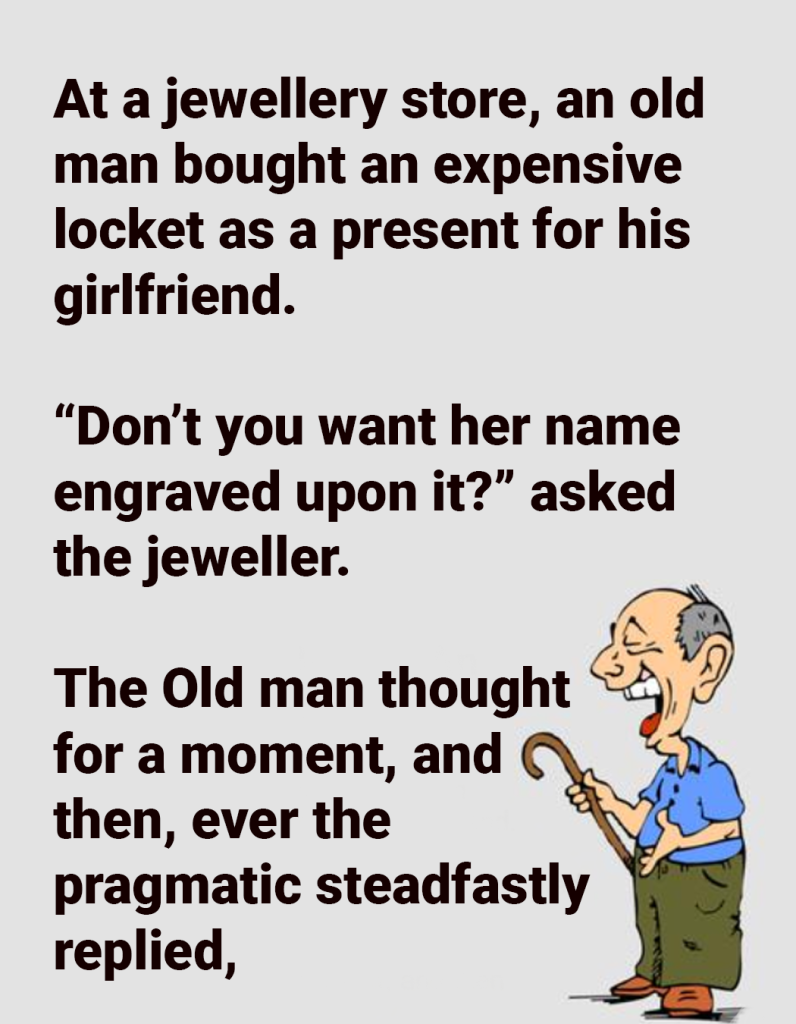 The old man paused for a moment, then answered pragmatically, “No, just engrave it: ‘To My One And Only Love.’ That way, if we ever break up and she throws it back at me in anger, I can use it again.”