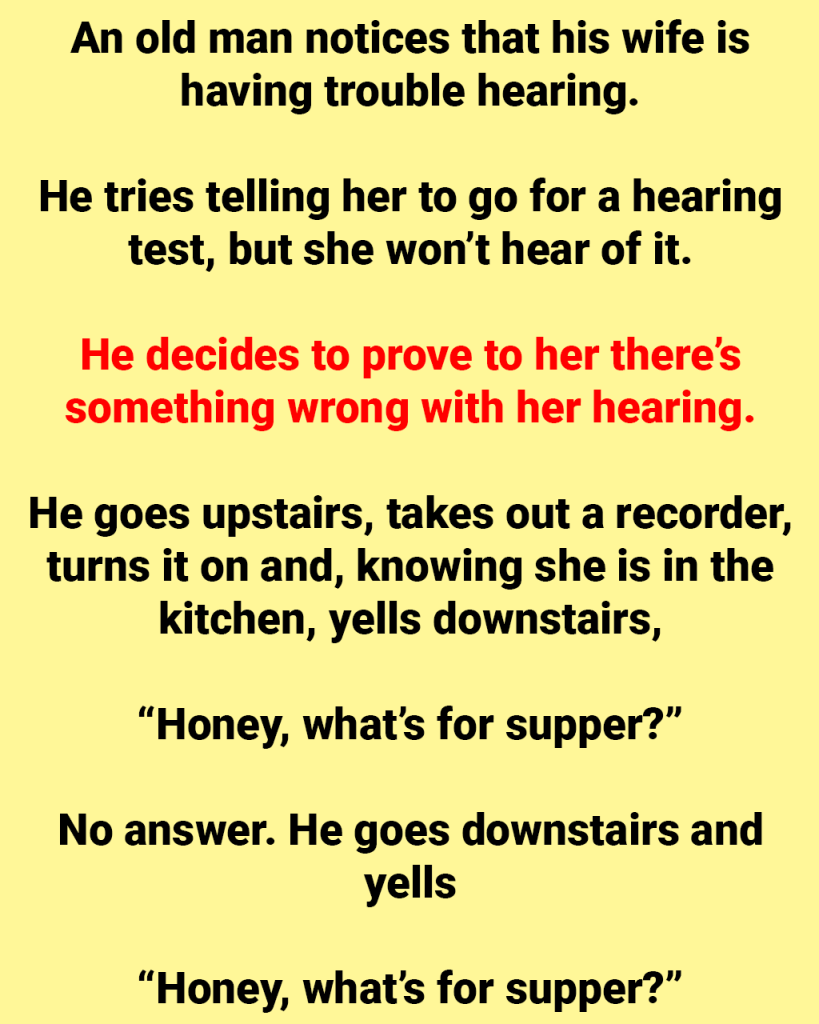 Determined to prove that her hearing was the problem, he came up with a plan. He went upstairs, grabbed the answering machine, and turned it on. Knowing she was in the kitchen, he shouted down, “Honey, what’s for dinner?”