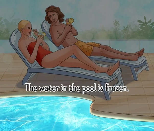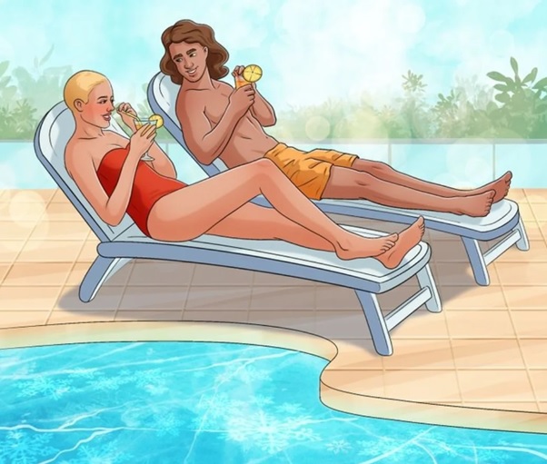 It includes a youthful couple loosening up by the pool, getting a charge out of mixed drinks.
