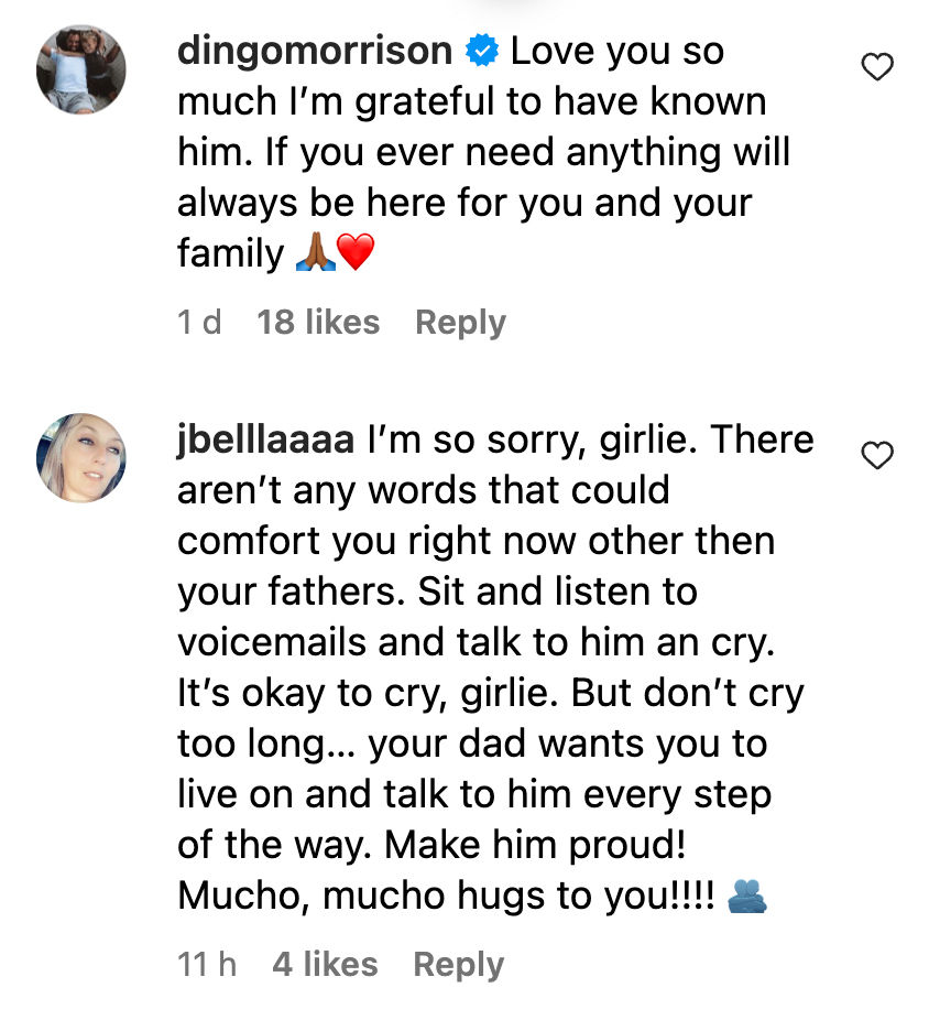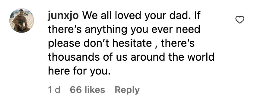 “Your dad was adored by us all. There are thousands of people on the planet who are there to help you if you ever need anything,” one user said. Another added: “I love you so much, I’m grateful I got to know him. We are always available for you and your family if you need anything.