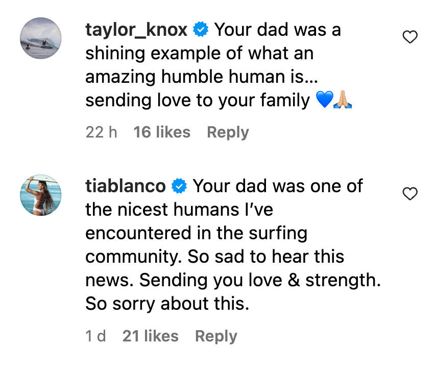 Tia Blanco, another famous surfer, expressed her sympathies in the comments section, saying your dad was one of the kindest people she’s ever met. I was shocked when I got this news. Sending you love and courage. we apologize for that.