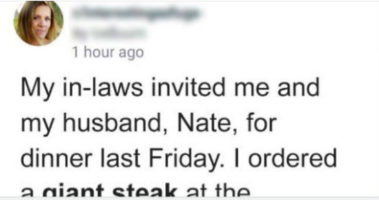 During a family dinner, a woman who was starving after a long day and had no previous meals due to her hectic schedule ordered a hearty steak for herself and her husband. Due to her mother-in-law’s judgmental comments about her food choices and eating habits, the situation escalated when the woman was accused of putting on a spectacle and attracting unnecessary attention.