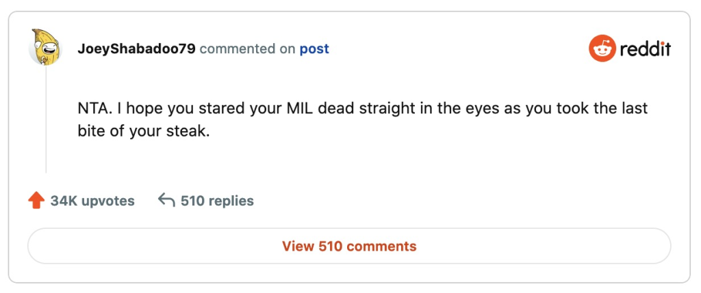 Someone even expressed the hope that the woman would look her mother-in-law in the eye when she took her last bite of steak.
