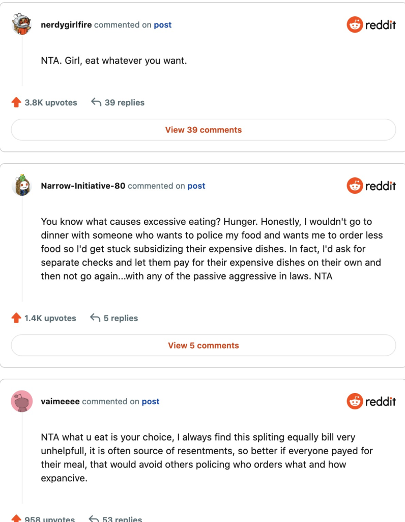 “I wouldn’t go out to dinner with someone who wants to police my food and wants me to order less food so I’m stuck subsidizing their expensive meals,” the individual stated.
