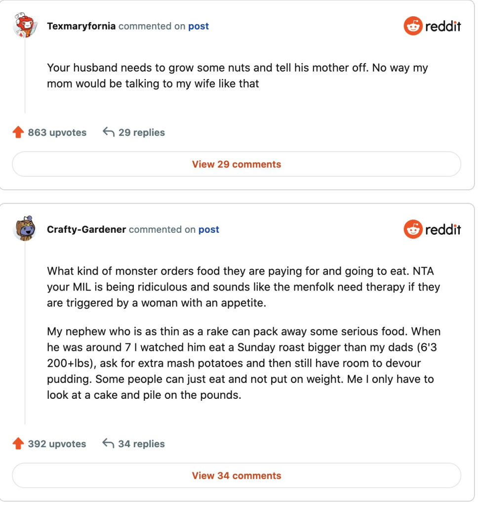 “My MIL started making comments [about] how I shouldn’t order what I can’t eat because even her husband wouldn’t be able to finish the food, let alone someone my size,” the woman claimed. But all she could do was smile and offer to take any leftovers home.