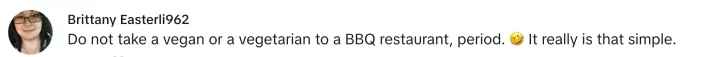 Although not everyone agreed, many people highlighted the fact that the restaurant mainly serves meat. No BBQ restaurant would serve a vegetarian or vegan. Another person said: “It really is that simple.