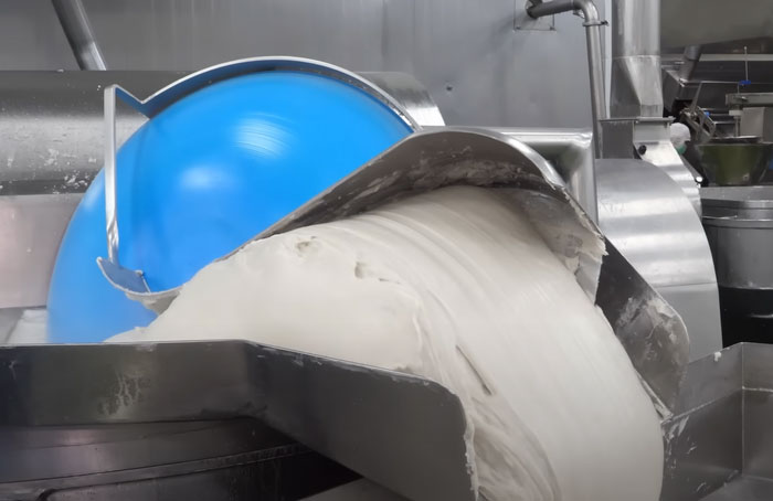 The next step is to extract this liquid and feed it to a machine that separates the material into a single long strip of meat.