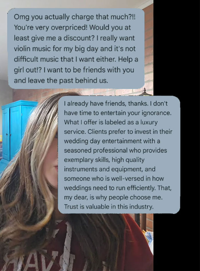 “Hello. 1. It’s pretty presumptuous of you to think I’d give you a service for $2,500. 2. You’ve been pestering me since I was in [symphony] in high school. 3. Make me a portfolio ?” “I may not realize it, but I’ve been recognized by The Knot and Wedding Wire for six years running,” replied the fiddler from Chicago. My ‘portfolio’ dates back to when I was twelve years old. I have 19 years of experience in the wedding industry.”