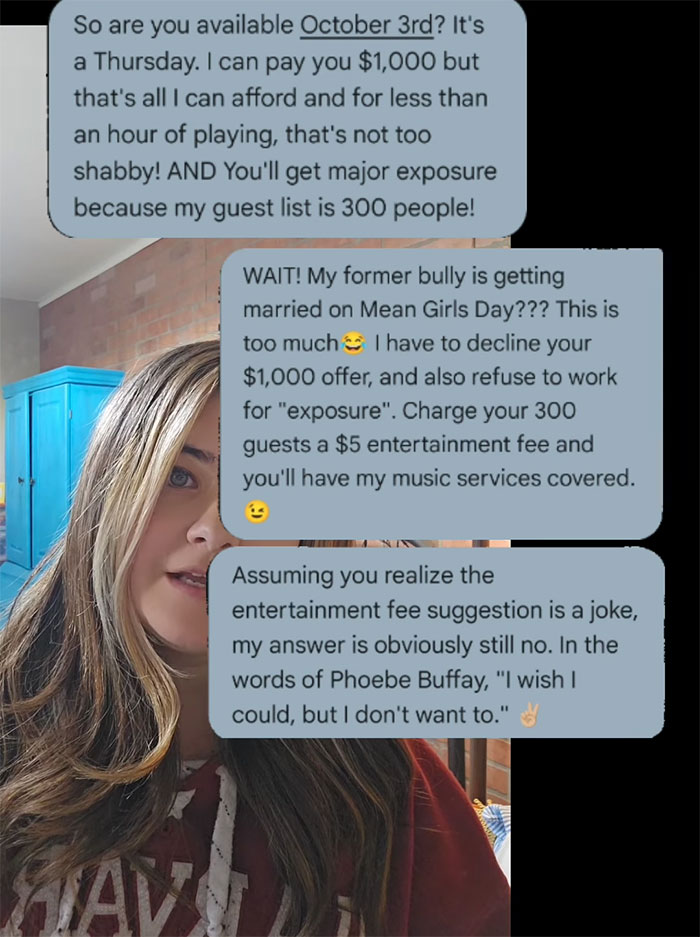 “WAIT! Is Mean Girls Day a good day to marry my childhood bully?” Tiffany commented, “That’s a lot,” referring to the famous movie about The Plastics, a group of girls who work their way to stardom in college. “I” am forced to decline your offer of $1,000 and say no to the job of “showing off.” If you charge $5 per person for entertainment among your 300 visitors, you can pay for my music services. Even if you admit that the entertainment offer is a farce, the reaction is undoubtedly negative, as Phoebe Buffay once said: “I wish I could, but I don’t want to.”