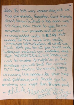 The total was about $100, so the $3.28 tip is less than 4% of that. Fortunately, the teenagers realized their mistake and took the right steps.