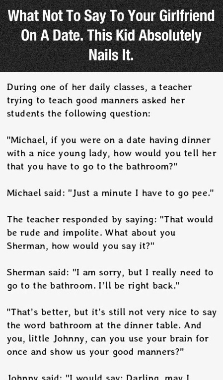 “Michael, assuming you were out on the town eating with a decent young woman, how might you tell her that you need to go to the washroom?”