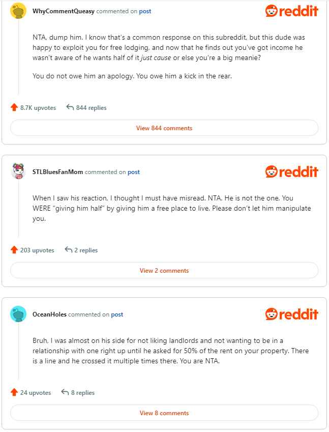 “He demanded that I give him 50% of the money I make from the rent or I’m just as bad off as he thought,” the OP wrote in her reply.