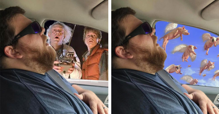 The monotony of a long road trip can often lead to moments of boredom, but for Sharea and Nate Overman, a simple snapshot turned their trip into a whimsical adventure. As she and her three sons toured Indiana to visit relatives, part-time photographer Sharea captured a hilarious picture of Nate lying in his seat, giving the impression that he was asleep at the wheel. Share joined a photo group on Facebook and invited members to Photoshop the background of the photo to create funny scenes and show Nate what he was missing during his sleep. Little did they know that this playful request would spark a wave of creativity from around the world, with people from Alaska to South Africa contributing their own imaginative creations. As the Overman family continued their journey, they found themselves enjoying the unexpected humor and joy that came from each new photoshopped image, turning what could have been a mundane journey into an unforgettable, laugh-out-loud experience.