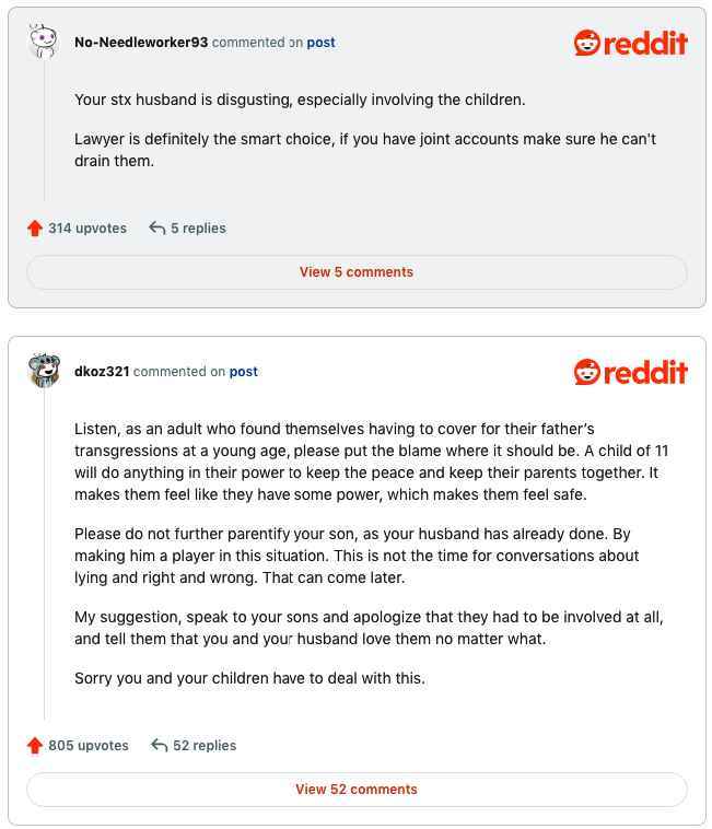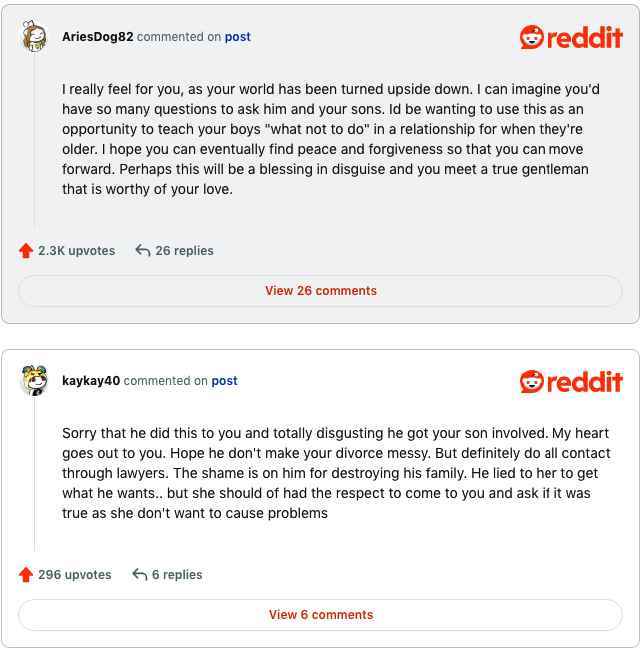 The devastated wife was supported by the Reddit community, which is known for its unwavering support during difficult times. Advice, anecdotes, and virtual hugs were exchanged with empathy. It turned out to be a testament to the power of internet networks to offer comfort and direction to people navigating the perilous seas of adultery and heartache.