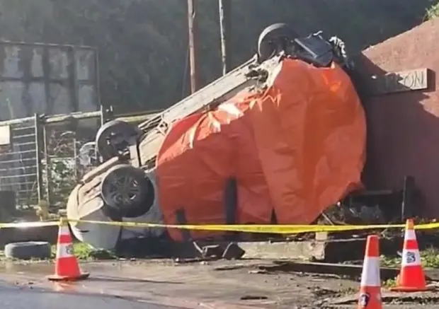 According to photos taken at the scene of the collision, her car was heavily damaged and overturned on the side of the road.