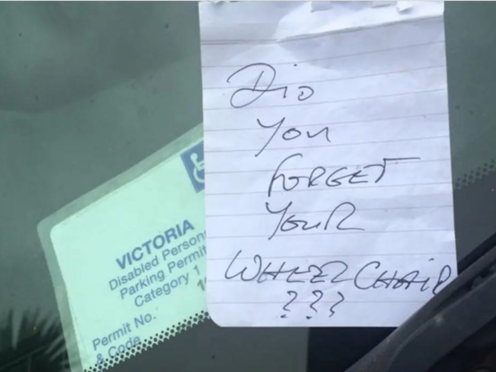One such day at Mitcham Shopping Center, Justina’s life took an unexpected turn. After carefully maneuvering her car into a designated handicap parking space, she discovered a note waiting for her on the windshield. The words in that note, though brief, were laced with venom and judgment. “Did you forget your wheelchair?” she asked a question that carried not only the weight of ignorance but also a bitter accusation. The person who left this message saw Justine exiting her car without the assistance of a wheelchair and assumed it was a handicapped parking violation.