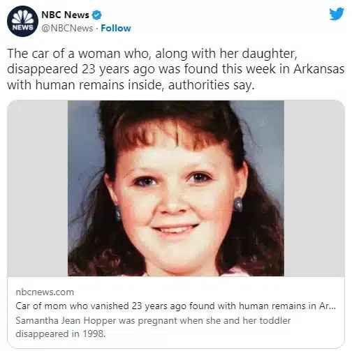 Authorities have verified the discovery of human remains in the car of a woman who went missing in Arkansas 23 years ago, in a major advance. Samantha Jean Hopper’s car was discovered under eight feet of water by cold case charity Adventures With Purpose. The discoveries give the case, which dates back to September 11, 1998, a long-needed breakthrough.