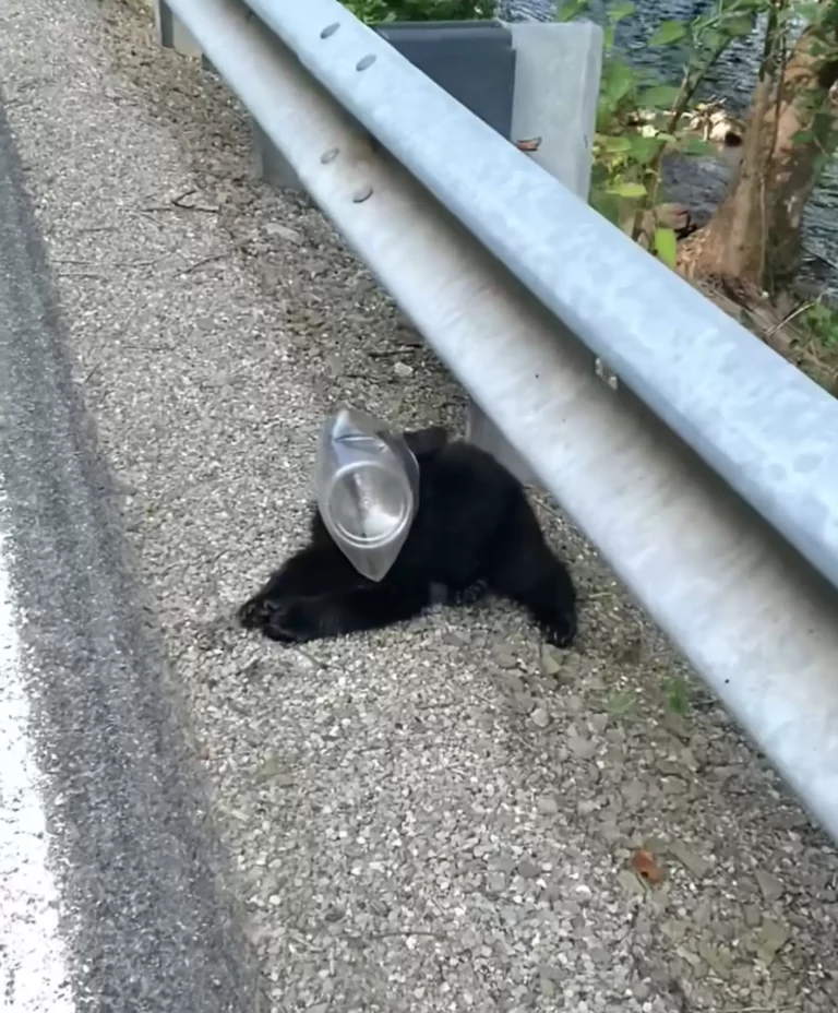 When Lindgren approached the animal, his suspicions were confirmed: the animal was a bear with its head safely wedged in a clear plastic container. Then life began to show.