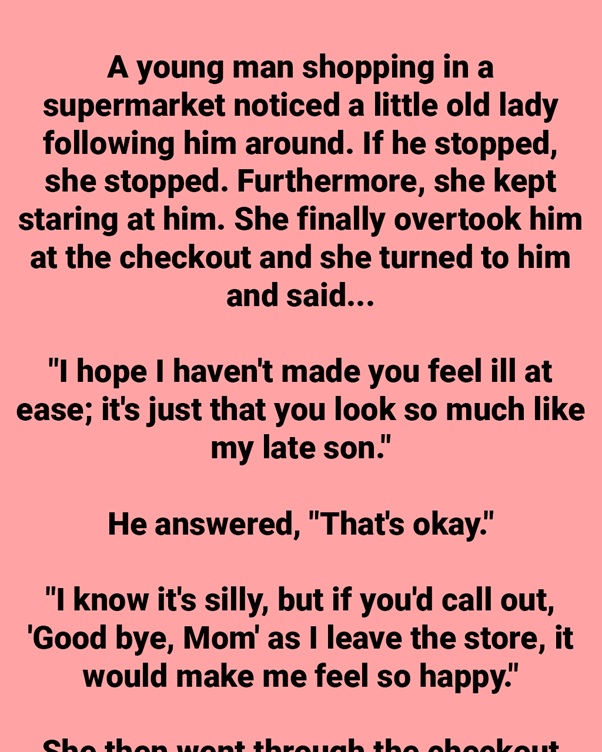 A young fellow shopping in a store saw a little old woman chasing after him. On the off chance that he halted, she halted. Besides, she continued to gaze at him. She at long last overwhelmed him at the checkout and she went to him and said…