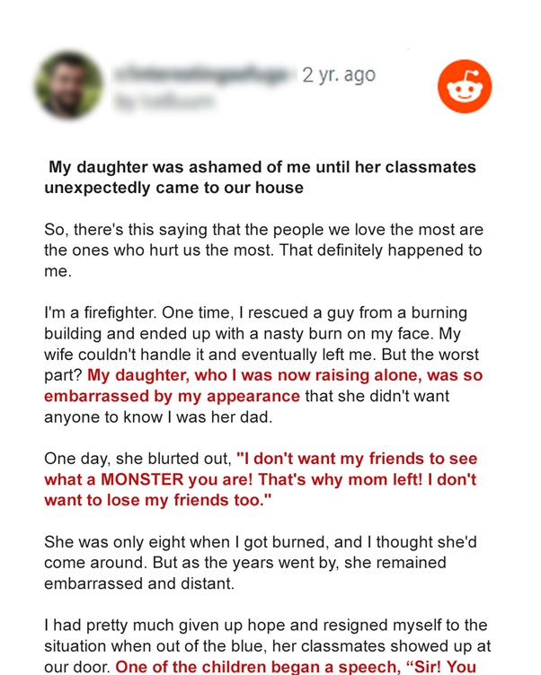 In the interim, different children were cheering and applauding! Sally could barely handle it. They weren’t sh:ocked by her dad’s appearance? Then, at that point, she recollected what Jeff’s sweetheart had said: “Your dad’s scars became undetectable the second I saw his heart.”